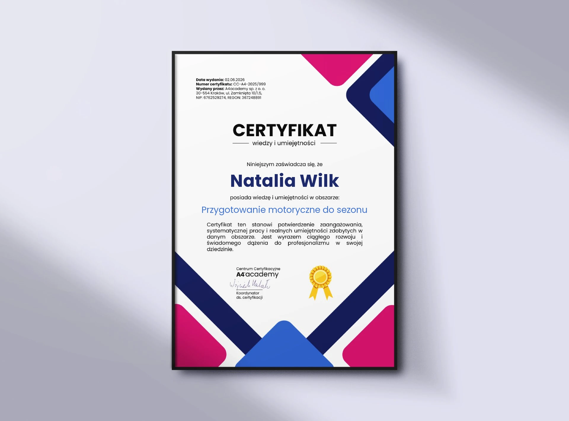 Pozytywne zaliczenie wszystkich pytań skutkuje wygenerowaniem imiennego certyfikatu. Dokument ten potwierdza wysokie kompetencje w zakresie racjonalnego planowania procesu treningowego, doboru odpowiednich środków oraz optymalizacji wyników sportowych przy jednoczesnej minimalizacji ryzyka kontuzji.